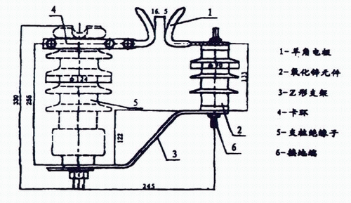 现场安装时,先将支柱绝缘子下端的螺母卸下,再将“Z”形支架大孔一端固定在支柱绝缘子下端(使另一端上翘)并用螺母拧紧。然后将避雷器元件竖直朝上固定在“Z”形支架的小孔一端。用卡环将左羊角间隙用M8×30的螺栓固定在支柱绝缘子的上端,右羊角间隙固定在避雷器的上螺栓上,羊角间隙上下左右对齐,最后调整羊角使其间隙距离为16.5mm。